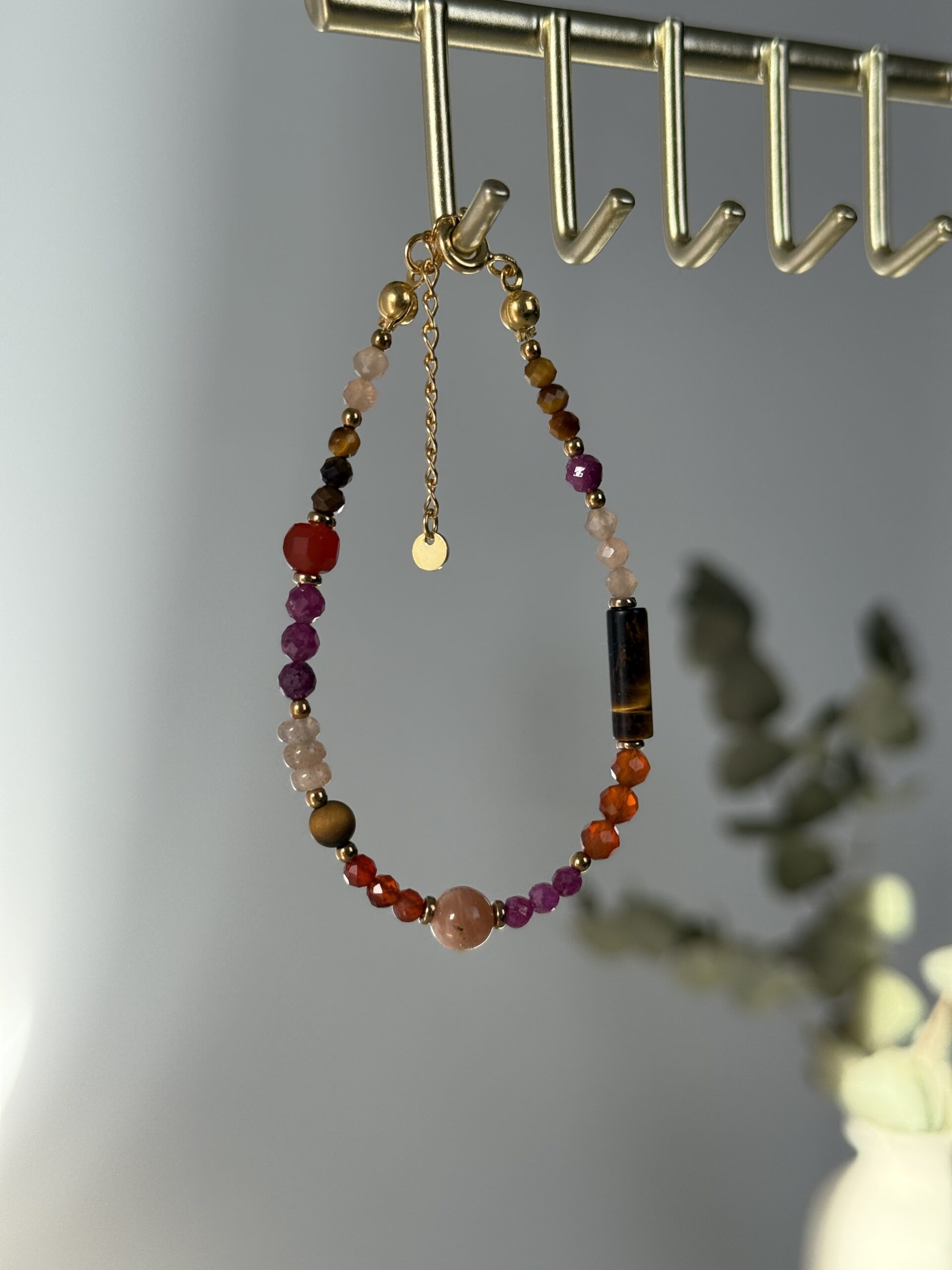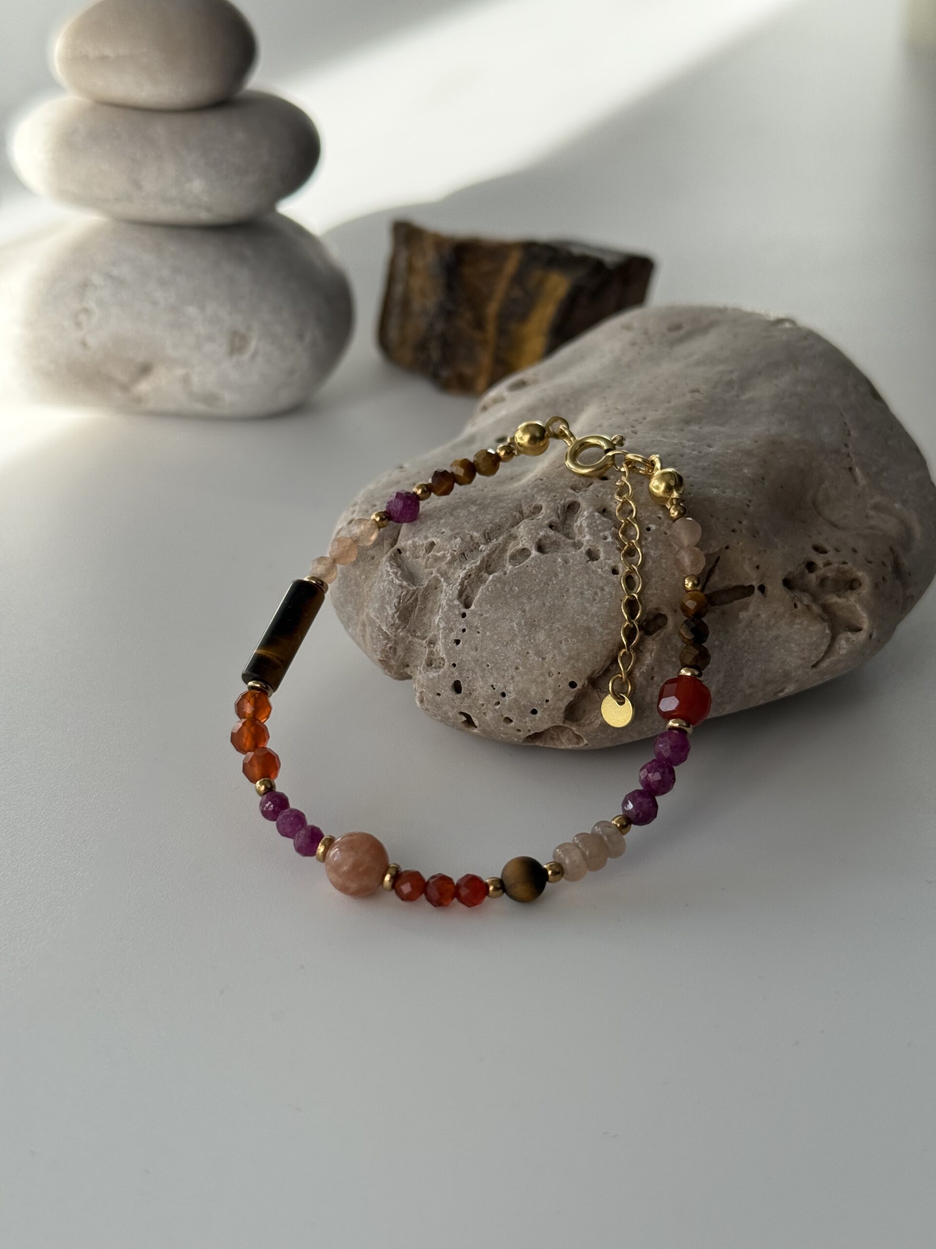 Użyte w bransoletce kamienie naturalne to KARNEOL, RUBIN, TYGRYSIE OKO oraz KAMIEŃ SŁONECZNY. Dodatkowo wzbogacona została przekładkami z hematytu w kolorze złotym lub srebrnym.