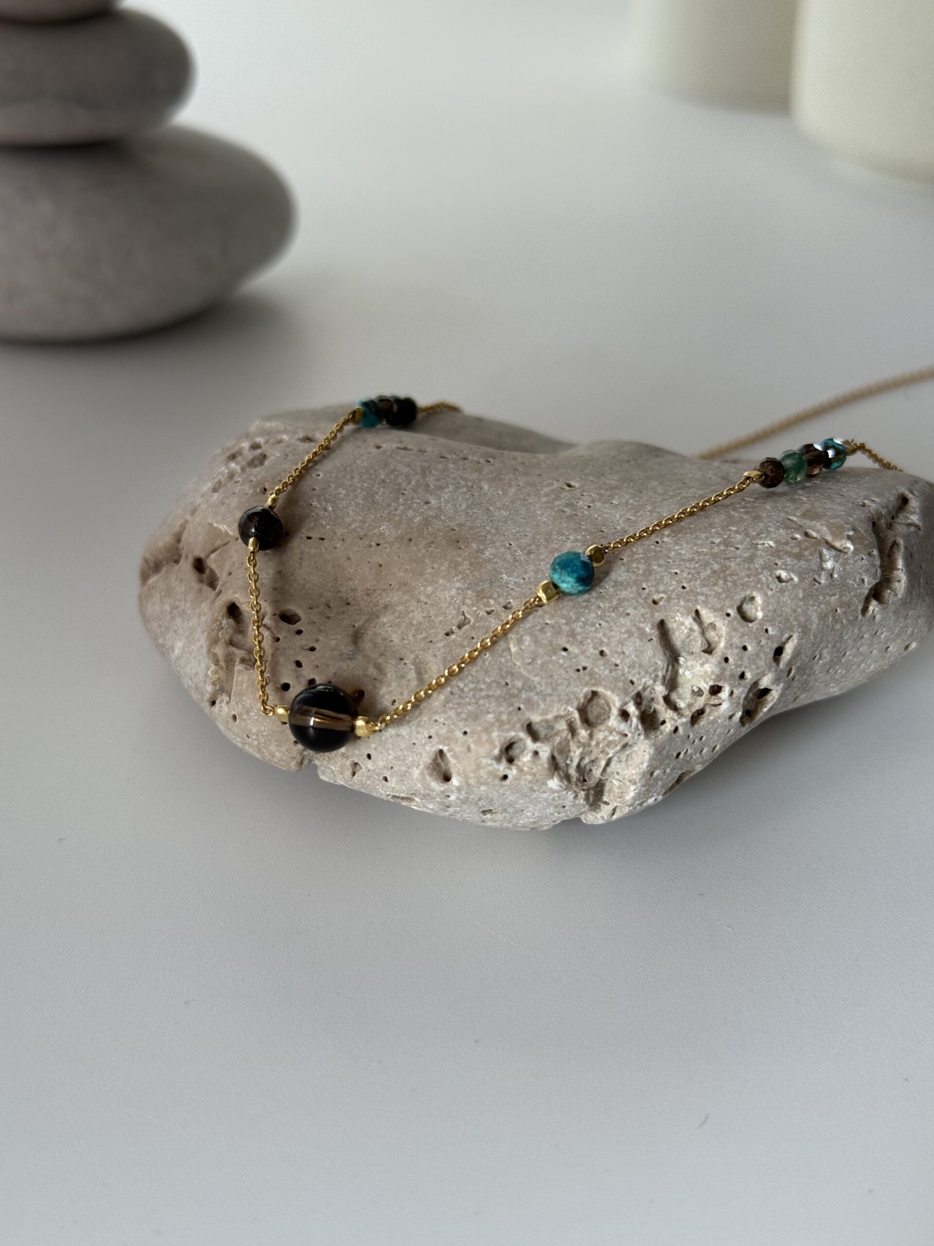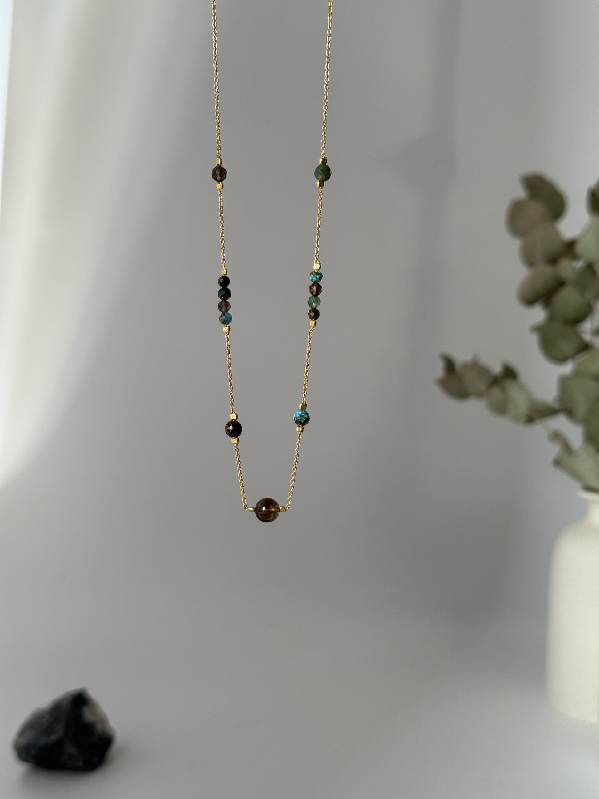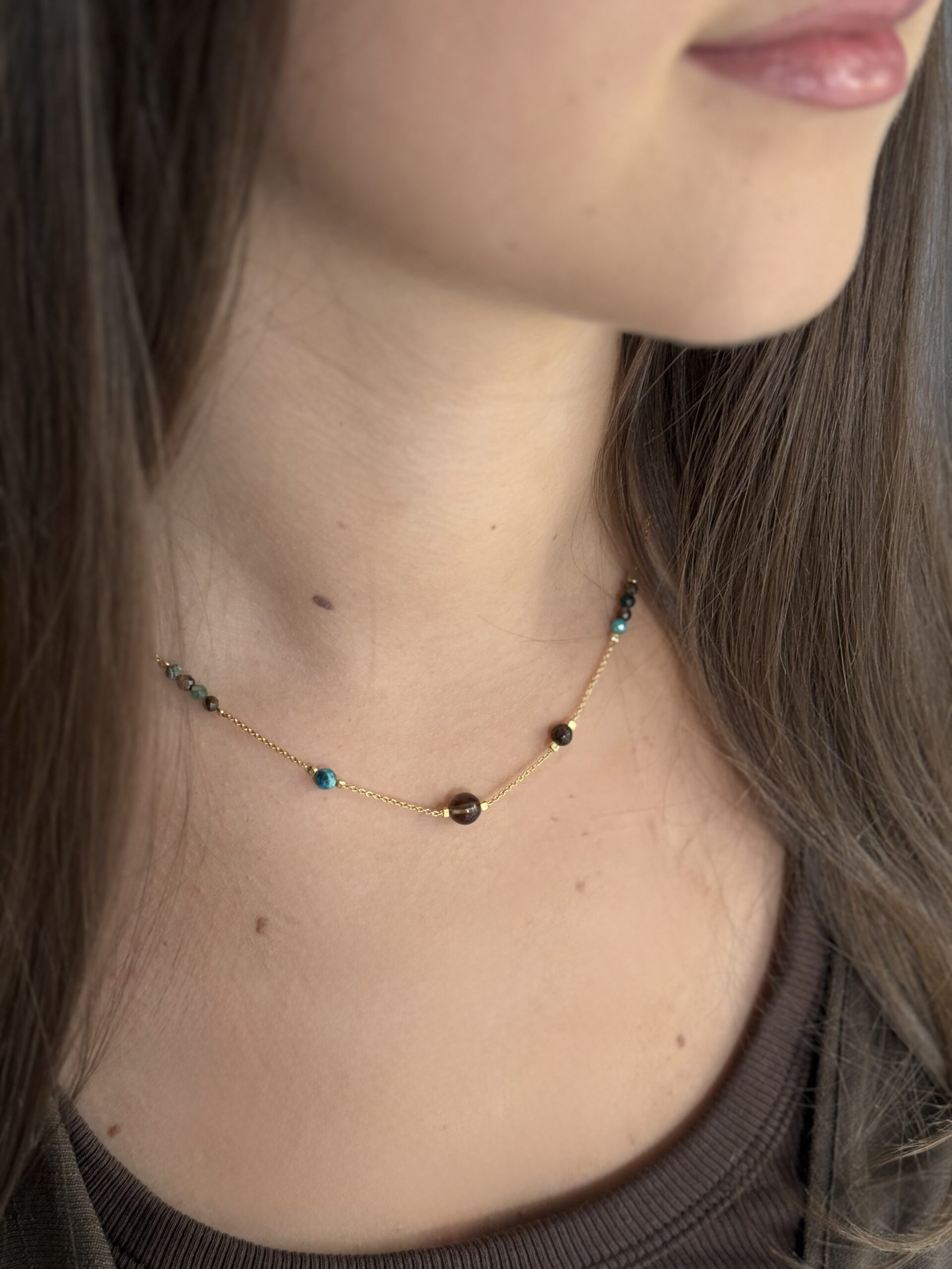 Użyte w naszyjniku kamienie naturalne to AGAT MSZYSTY, CHRYZOKOLA, KWARC DYMNY oraz BRONZYT.